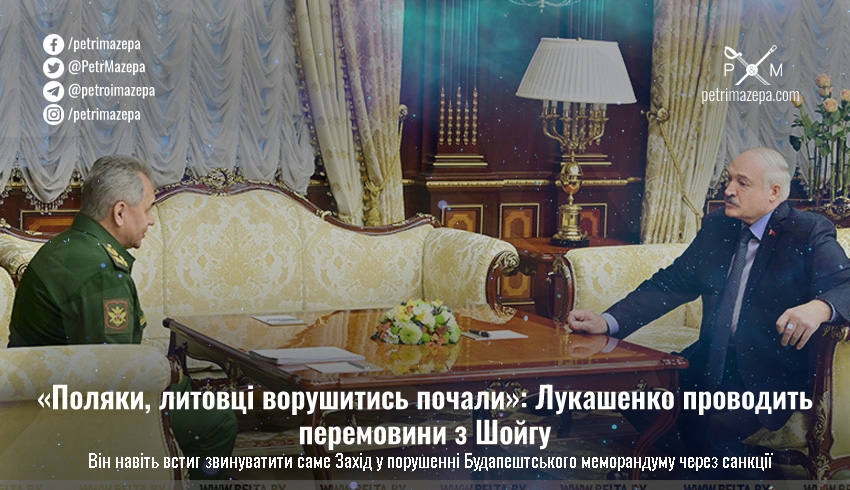 Диктатор Білорусі Лукашенко провів зустріч із міністром оборони росії Шойгу — він розповідав, що на Білорусь знову готується напад, і що не росія порушила Будапештський меморандум нападом на Україну, а «всі західні держави», які нібито порушили безпеку росії своїми санкціями.