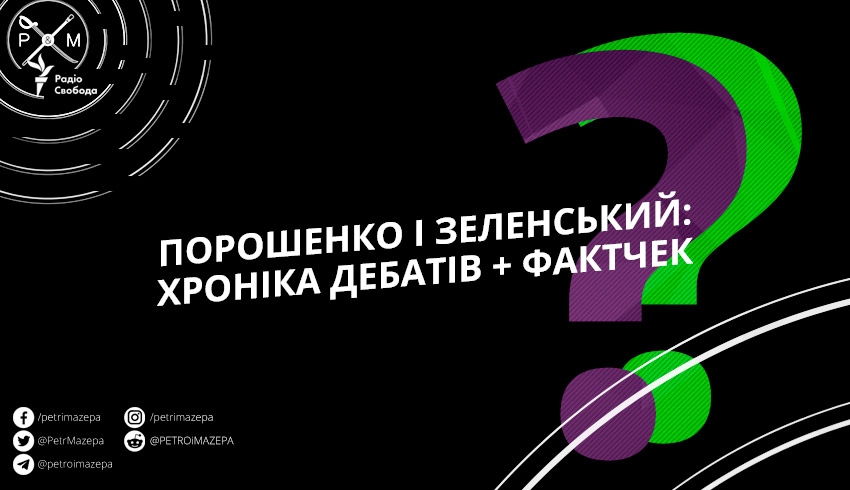 «Радіо Свобода» транслювало наживо дебати кандидатів у президенти — Петра Порошенка й Володимира Зеленського. 19 квітня о 19:00 політики розпочали свою дискусію на НСК «Олімпійський». Після цього, о 21:00, офіційні дебати перемістились до студії Суспільного телебачення, однак туди прийшов лише Петро Порошенко.