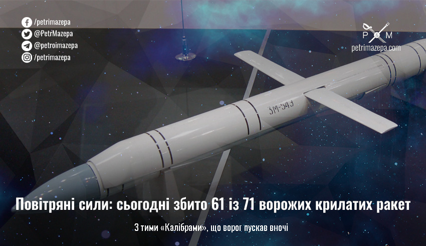 Станом на 11.30 противник здійснив 71 пуск крилатих ракет Х-101, Х-555, «Калібр» (в т.ч. нічні пуски). Силами та засобами протиповітряної оборони Повітряних Сил та інших складових Сил оборони України знищено 61 крилату ракету ворога та 5 дронів-камікадзе «Shahed-136/131», про які повідомляли раніше, пише пресслужба Повітряних сил.