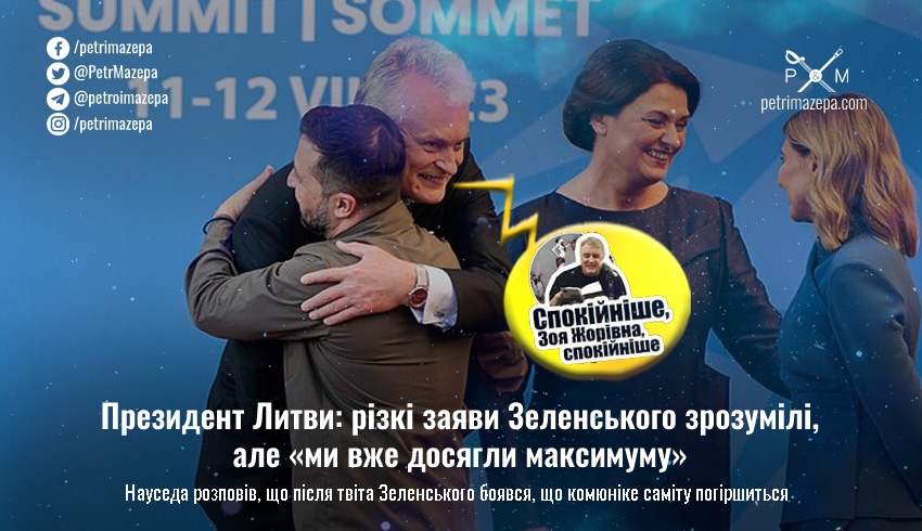 Він додав, що інші учасники саміту, не можуть «навіть відчути ситуації людини, яка очолює країну, яка захищається від кривавого агресора. Але через емоційний фон повідомлення, яке було одним з переговорних важелів, «я просто дуже добре усвідомлював, що ми вже досягли максимуму, і будь-яка спроба вийти за межі сьогоднішнього максимуму зруйнує сам Вільнюський саміт».