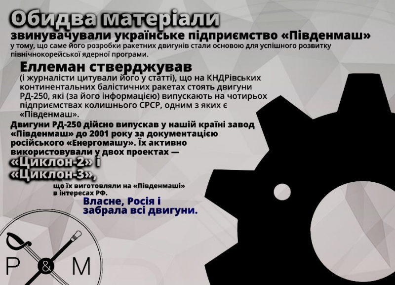 Обидва матеріали звинувачували українське підприємство «Південмаш» у тому, що саме його розробки ракетних двигунів стали основою для успішного розвитку північнокорейської ядерної програми. Еллеман стверджував (і журналісти цитували його у статті), що на КНДРівських континентальних балістичних ракетах стоять двигуни РД-250, які (за його інформацією) випускають на чотирьох підприємствах колишнього СРСР, одним з яких є «Південмаш».