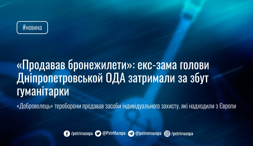 «За даними слідства, чоловік, який раніше обіймав посаду заступника голови Дніпропетровської ОДА, перебуваючи далеко від лінії зіткнення зі збройними силами рф, займався збутом гуманітарної допомоги. Він продавав бронежилети та інші засоби індивідуального захисту, які надходили від європейських партнерів на безоплатній основі та призначались для потреб Збройних Сил України. Чоловіка викрили безпосередньо під час збуту гумдопомоги», — повідомляє Офіс генерального прокурора.