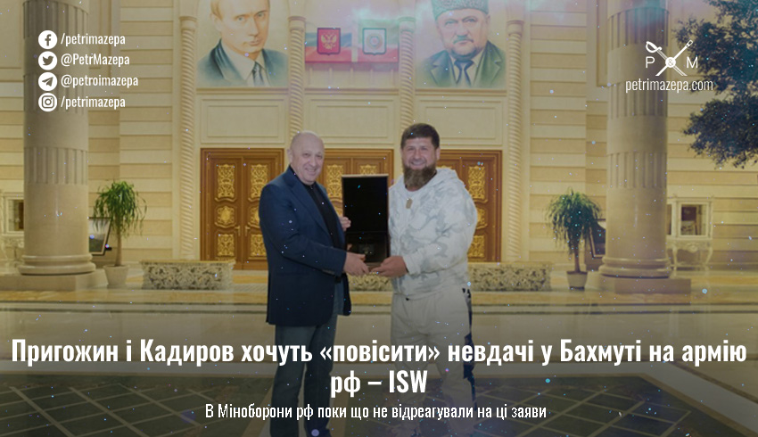 Інститут вивчення війни (ISW) оцінює скоординовану позицію засновника ПВК «Вагнер» Євгена Пригожина та лідера Чечні Рамзана Кадирова стосовно ситуації в Бахмуті, як спроби підготувати плацдарм для того, щоб звинуватити Міноборони рф у невдачах у районі Бахмута.