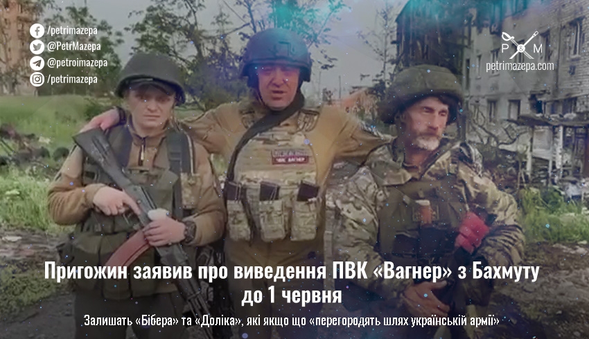 Ватажок бойовиків ПВК «Вагнер» Пригожин заявив, що його бойовики вийдуть з Бахмуту до 1 червня, залишать лише «Бібера» та «Доліка», які «мали основну роль» у окупації міста, й якщо що «зупинять ЗСУ».