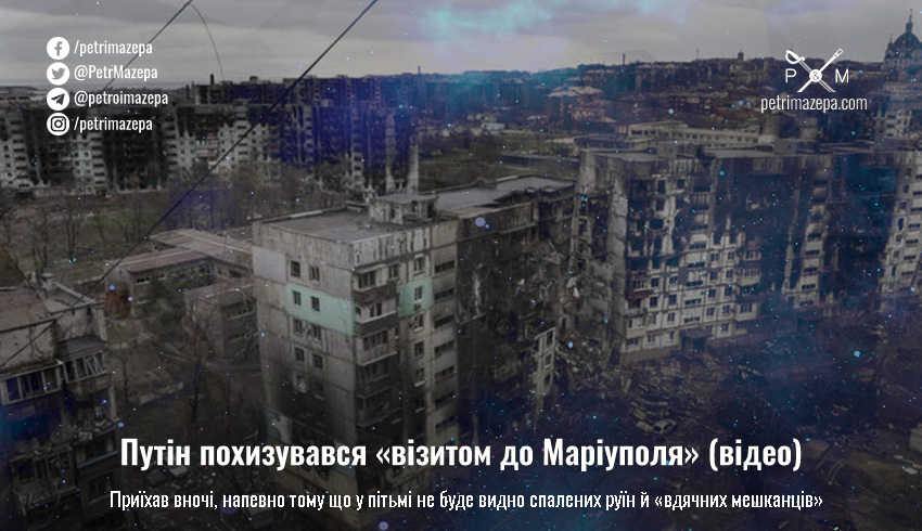 Росіяни заявили, що путін відвідав Маріуполь — судячи з оприлюднених відео, російський диктатор приїхав туди вночі, проїхав містом, побачив «благоустрій», який, звісно, видавали за російський, і поспілкувався з людьми, які, звісно, випадково опинились на вулиці під час комендантської години. І, звісно, вночі на відео не можна побачити, скільки зруйнованих будівель стоїть навколо.