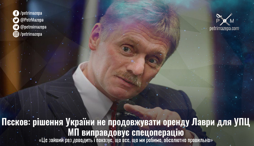 Прессекретар російського диктатора Дмитро Пєсков заявив, що рішення української влади не продовжувати оренду території Києво-Печерської лаври для представників УПЦ МП «підтверджує правильність проведення спецоперації в Україні».