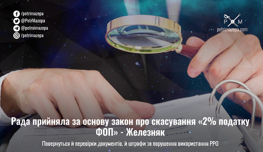 Про це повідомив у Telegram нардеп Ярослав Железняк. Законопроєктом скасовуються пільги по сплаті податку для 1 та 2 групи ФОП, відновлюються документальні перевірки та повертаються штрафні санкції за порушення у використанні реєстраторів розрахункових операцій (РРО).