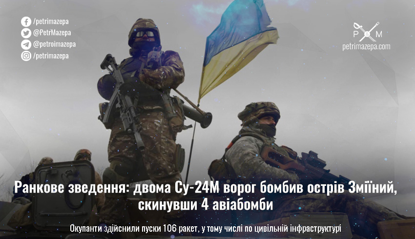 Ранкове зведення: двома Су-24М ворог бомбив острів Зміїний, скинувши 4 авіабомби
