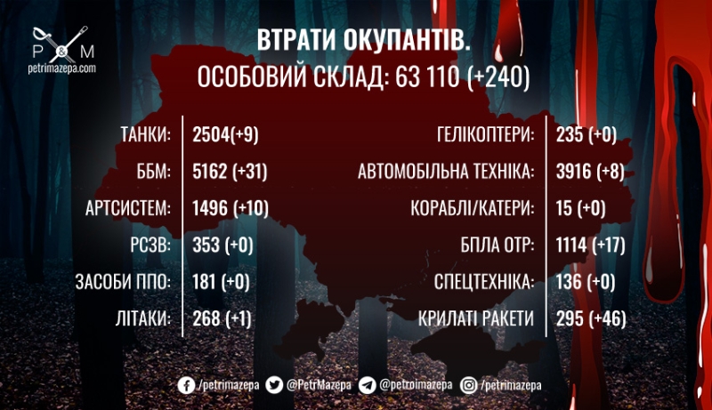 Розпочалась 230-а доба протистояння української нації російському широкомасштабному вторгненню. Не досягаючи успіху, ворог завдає ракетних ударів та активно застосовує ударні БПЛА для ураження критичної інфраструктури та густонаселених міст нашої країни. Противник не здатен зупинити успішний контрнаступ Сил оборони на Харківському та Херсонському напрямках, тому намагається залякати та посіяти паніку серед населення України.