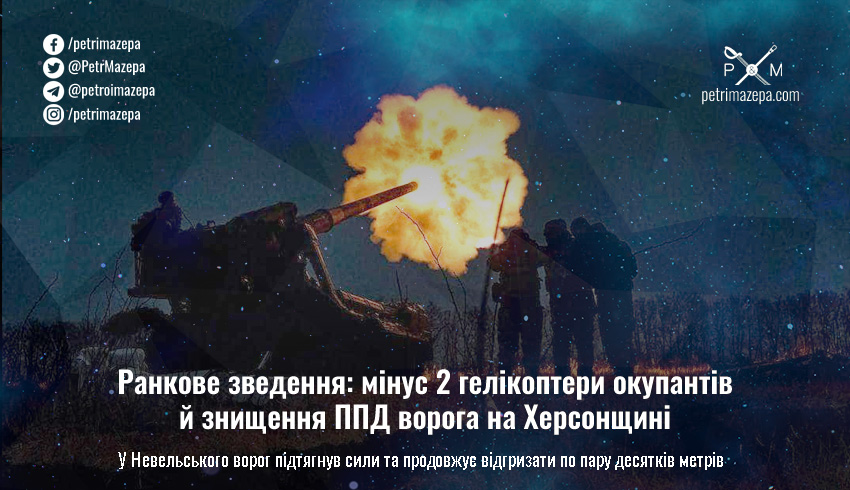 Ранкове зведення: мінус 2 гелікоптери окупантів й знищення ППД ворога на Херсонщині