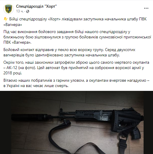 Також вчора увечері на сторінці спецпідрозділу «Хорт» з’явилась інформація про ліквідацію заступника начальника штабу ПВК «Вагнера». Наразі цей пост — це вся наявна інформація на тему.