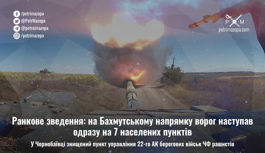 Розпочалася 162-га доба героїчного протистояння української нації російському воєнному вторгненню. Ворог нарощує активність своїх атак біля Бахмута, а також проводить спроби покращення тактичного положення та розвідки на інших напрямках. Найбільш активно серед обласних центрів рашисти обстрілюють Миколаїв і Харків.