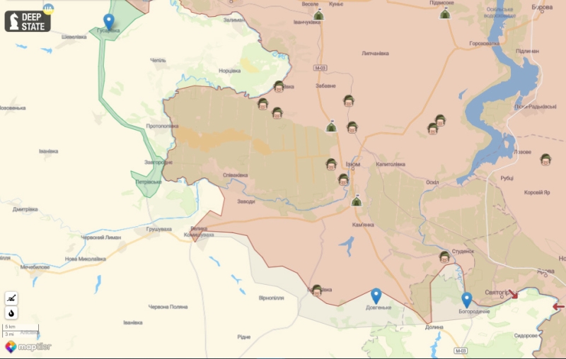 На Слов’янському напрямку були обстріли неподалік 6 населених пунктів. Окупанти намагалися просунутися в напрямку Довгеньке — Богородичне (дві нижні мітки). Отримали відсіч і відійшли. На цьому напрямку у ворога знову поменшало захопленої території.