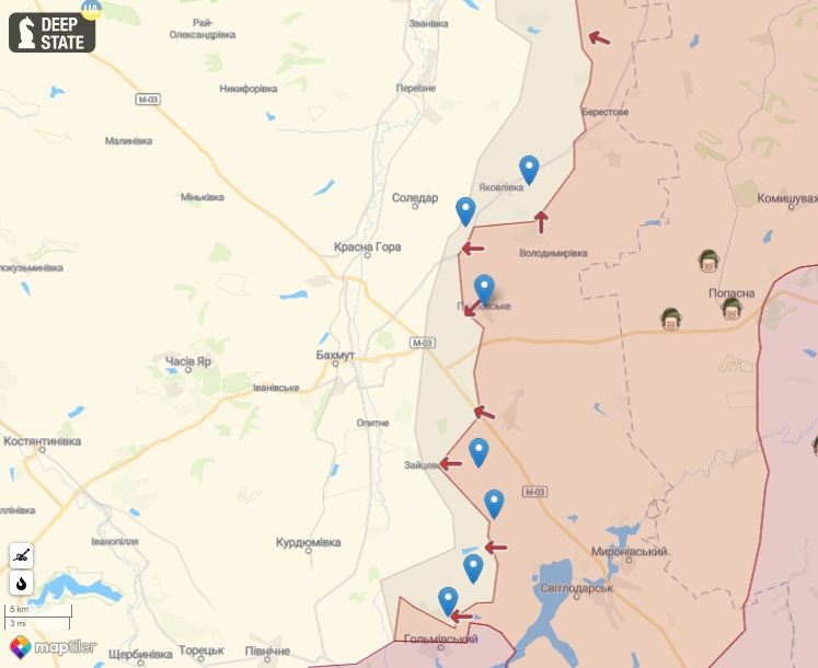 На Бахмутському напрямку противник з артилерії обстрілював Бахмут і ще 8 населених пунктів. Завдав авіаударів поблизу Яковлівки, Соледара та Кодеми. Наступати (покращити тактичне положення) рашисти намагалися на напрямках Стряпівка — Соледар (друга зверху мітка), Доломітне — Травневе (нижня мітка), Відродження — Вершина (четверта знизу), Покровське — Бахмут (третя зверху), Василівка — Яковлівка (верхня мітка), Семигірʼя — Вершина (третя знизу). На всіх цих напрямках ворог успіху не мав і відійшов. Веде наступальні дії в напрямку Новолуганське — Кодема (друга знизу), бойові дії тривають.