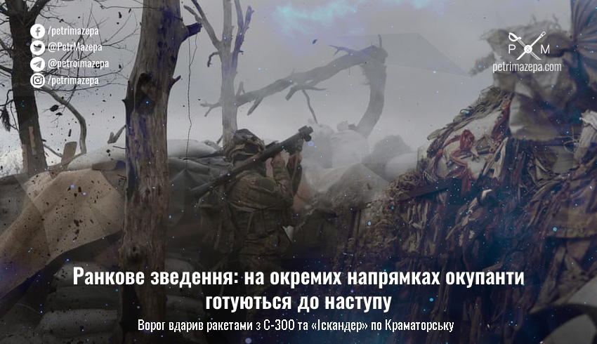 Очільник Донецької ОВА повідомив, що ворог вчора бив по Краматорську спочатку з С-300 (по району кладовища), а потім вдарив «Іскандером» по житловому будинку в центрі міста. Відомо про загиблих і поранених. Рашисти одразу почали видавати різні версії, як вони роблять ще з часів збиття MH17 у спробах уникнути відповідальності. На цей час серед таких версій — удар по складу БК, робота ППО та «високоточний Іскандер» промазав майже на квартал.