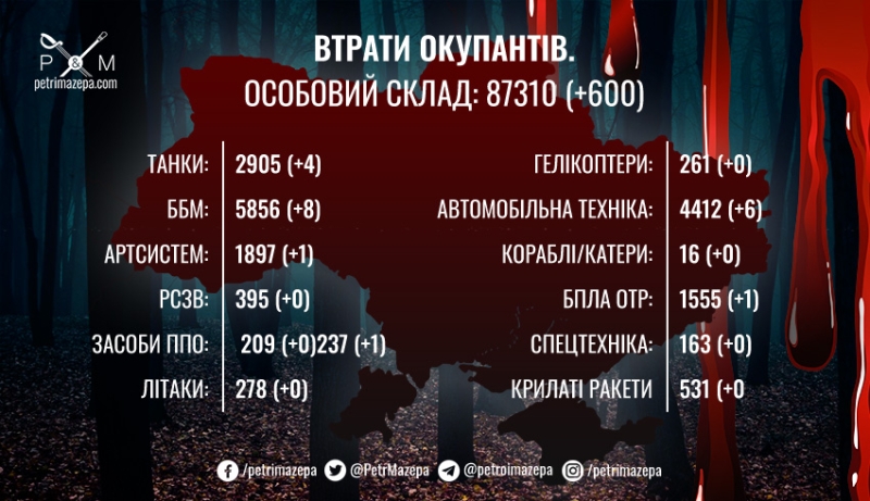 Підтверджено вогневе ураження 25 листопада районів зосередження живої сили росіян у районах населених пунктів Мелітополь, Пологи та Михайлівка Запорізької області. Втрати окупантів склали понад 100 осіб пораненими, знищено близько 10 одиниць військової техніки різних типів і 2 склади боєприпасів.