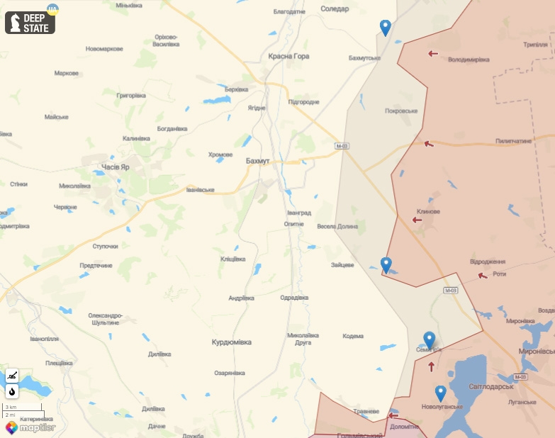 Ворожі штурмові та наступальні дії у напрямку Вершини та Семигір’я (дві середні мітки на мапі) наші воїни успішно відбили. Тривають бої в районах Новолуганського (мітка на півдні мапи) та Соледара (мітка на півночі).