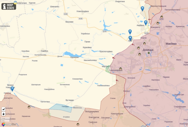 На Авдіївському, Новопавлівському та Запорізькому напрямках, окрім обстрілів по лінії зіткнення, ворог завдав авіаудару неподалік Новоандріївки. Ворожа розвідка боєм у напрямках Водяного та Пісків (дві мітки нижче Авдіївки) завершилась втратами та відступом. Противник намагався наступати в напрямках Авдіївки (друга з верху мітка), Красногорівки (най північніша мітка) та Великої Новосілки (південний захід мапи). Зазнав втрат та відійшов.