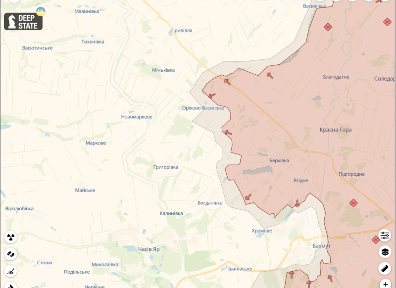 За даними Deep State, ворог намагається розширити вбитий по трасі Е40 клин, він перейшов балку Дубовий Яр і продовжує рух у бік Оріхово-Василівки. З’явилась й інформація про можливий вихід ворога до траси на Бахмут неподалік Іванівського. Ситуація на північ від Бахмута виглядає, за оцінкою Deep State, «максимально дивно» — ворогу вдалося вбити клин по трасі, підійти з двох сторін до Залізнянського та наблизитися до Оріхово-Василівки, бої біля якої точаться вже більше ніж тиждень.