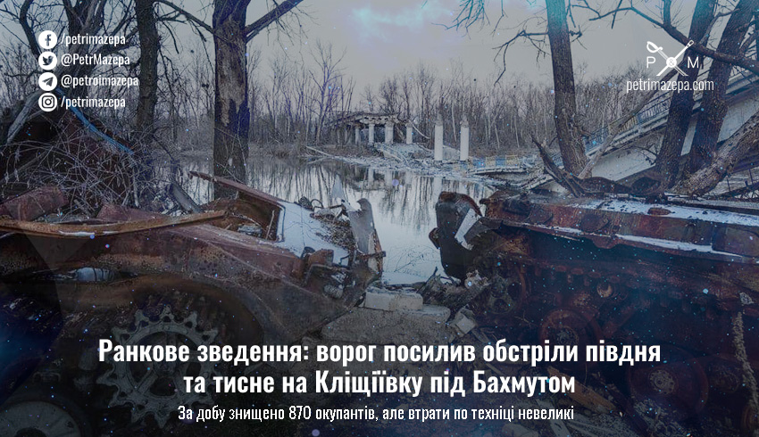 Ранкове зведення: ворог посилив обстріли півдня та тисне на Кліщіївку під Бахмутом