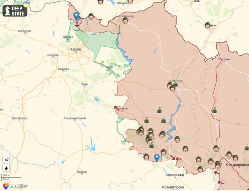 На Слобожанському напрямку противник намагається залишитись на своїх позиціях і не пропустити Сили оборони до кордону. На Харківському напрямку обстрілював райони Харкова та ще 12 н.п. Окупанти здійснили висування в напрямку Кочубеївка (верхня мітка на мапі) — Дементіївка, отримали відсіч та відійшли.