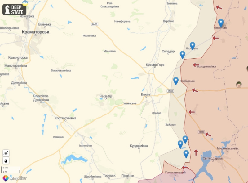 На напрямках Володимирівка — Соледар (третя зверху) та Покровське — Бахмут (четверта зверху) бойові дії тривають. На напрямках Відродження — Кодема (третя знизу) та Доломітне — Семигір’я (нижня мітка) українські воїни завдали потужного вогневого ураження та змусили окупантів відійти.