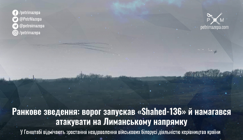 Ранкове зведення: ворог запускав «Shahed-136» й намагався атакувати на Лиманському напрямку