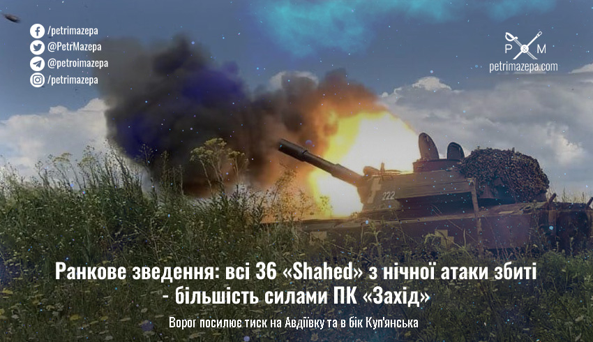 На Авдіївському — ворог за добу втратив 3 танки. А в цілому по фронту ворог посилює тиск на Авдіївку та в бік Куп'янська, при цьому намагається не втратити ініціативу в Мар'їнці та Бахмуті.