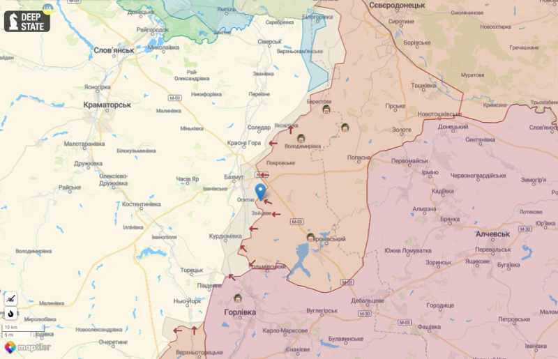 - на Бахмутському — в районах н.п. Соледар, Бахмут, Часів Яр, Курдюмівка, Опитне, Зайцеве та Нью-Йорк;