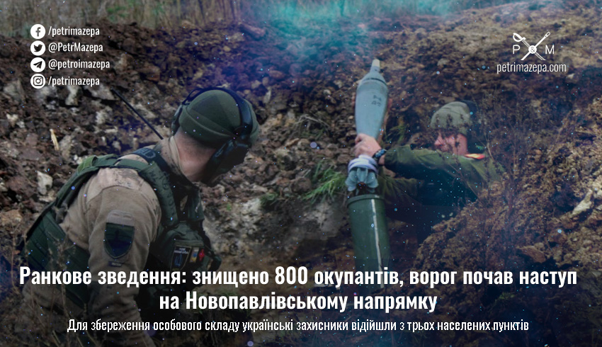 Ранкове зведення: знищено 800 окупантів, ворог почав наступ на Новопавлівському напрямку