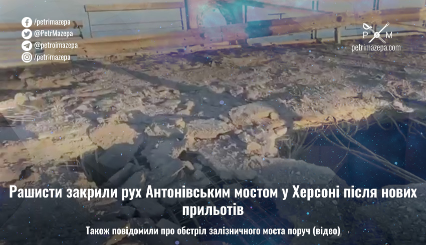 А перший заступник голови Херсонської облради Юрій Соболевський упевнений, що Антонівський міст отримав суттєві пошкодження та «відновлювальні роботи займуть дуже багато часу та вимагатимуть ресурсів» рашистів.