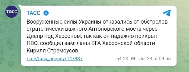 - 20 липня окупанти заявили про «обмеження руху» Антонівським мостом через Дніпро — «фактично зруйнованим» мостом дозволять їздити легковим автомобілям
