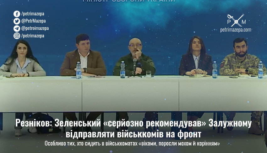 Міністр оборони Олексій Резніков на брифінгу заявив, що президент Володимир Зеленський «серйозно рекомендував» головнокомандувачу Збройних Сил України (ЗСУ) Валерію Залужному відправляти військкомів на фронт.
