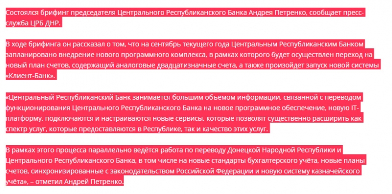 Ось один із пазлів, який є у відкритому доступі. Так званий «ЦРБ ДНР» оголосив про перехід на новий план розрахунків (архів). З 19 серпня почалось переведення на нові розрахунки і фізичних осіб. Фото з розшифруванням нової структури рахунків, яка буде прийнята.