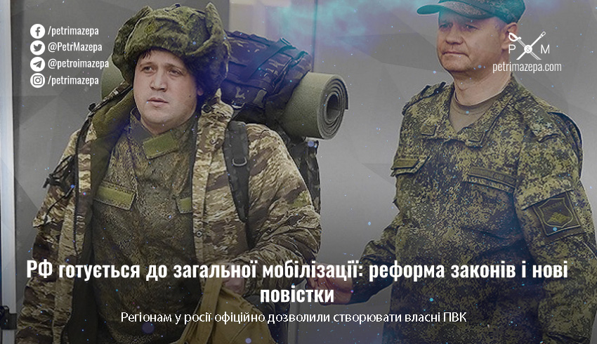 За підсумками вчорашньої «роботи» законодавців у росії тепер підвищено вік перебування в запасі й вік призову, штрафи за неявку зросли до 30 тис. рублів, виїзд за кордон заборонено одразу після появи повістки в реєстрі, юристам заборонено представляти росіян у військкоматах і навіть оскаржувати дії комісій, а регіонам дозволили створювати приватні військові компанії, пише «Настоящее время». За оцінками правозахисників, ці поправки будуть потрібні, якщо Росії знадобиться загальна мобілізація.
