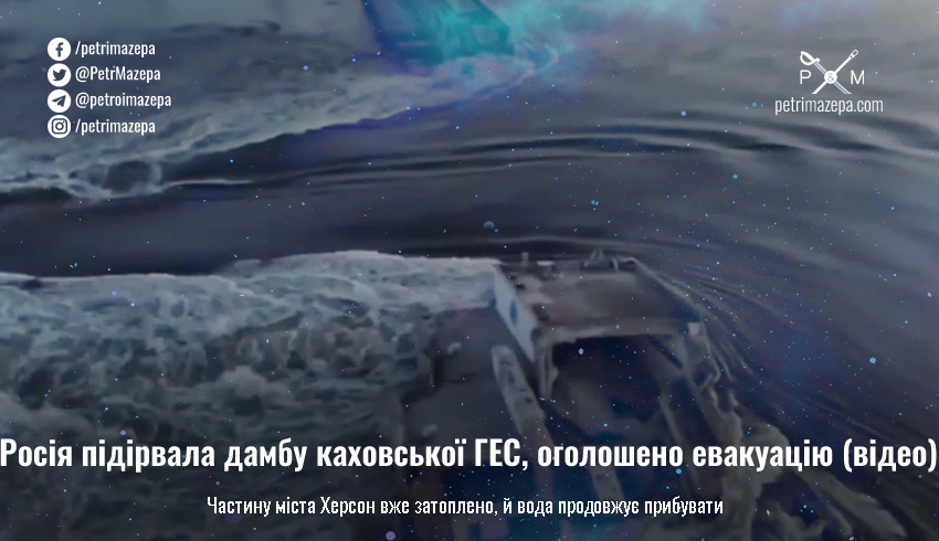 Росія підірвала дамбу Каховської ГЕС, оголошено евакуацію, в тому числі частково з міста Херсон, затоплення вже почалось, а за 5 годин рівень води сягне критичного рівня.
