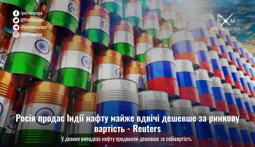Росія продає нафту у Індію за 32-35 доларів за барель, що майже вдвічі нижче за встановлені США та ЄС обмеження ціни та в деяких випадках навіть дешевше за собівартість нафти, пише Reuters.