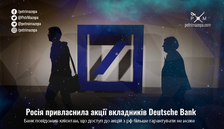Deutsche Bank повідомив клієнтам, що він більше не може гарантувати повний доступ до російських активів, які їм належать. Росія просто дозволила конвертувати деякі депозитарні розписки Deutsche Bank у місцеві акції, без дозволу, участі чи навіть нагляду самого банку.