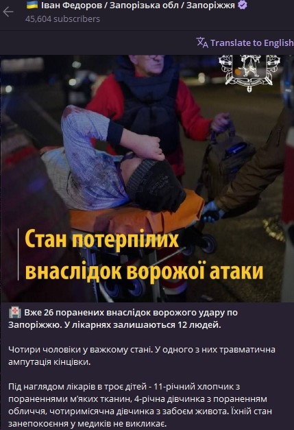 «Чотири чоловіки у важкому стані. У одного з них травматична ампутація кінцівки. Під наглядом лікарів троє дітей — 11-річний хлопчик із пораненнями м’яких тканин, чотирирічна дівчинка з пораненням обличчя, чотиримісячна дівчинка з забоєм живота. Їхній стан занепокоєння у медиків не викликає», — зазначив голова Запорізької обласної військової адміністрації Федоров.