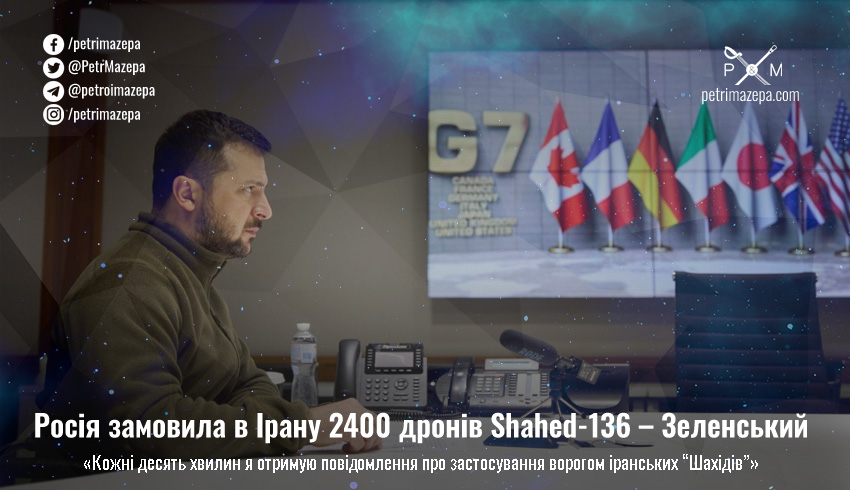 Президент Володимир Зеленський повідомив, що, за даними нашої розвідки, росія замовила в Ірану 2400 безпілотників Shahed-136, й кожні десять хвилин президент України отримує повідомлення про використання цих дронів.