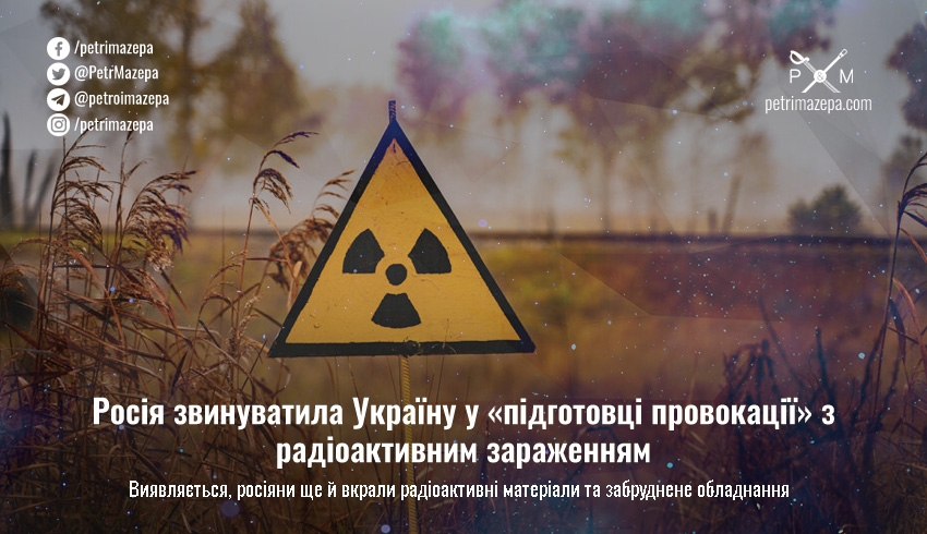 Саме міноборони ворога заявляє — нібито Україна та її партнери представлять вагомі докази того, що російська армія спричинила масштабне радіоактивне забруднення України. Через дії росіян райони біля дороги Київ-Прип’ять заражені, росіяни викрали радіоактивні матеріали, хімічні розчини, забруднене радіацією обладнання, небезпечні предмети й вивезли їх за зону відчуження, через що спричинили забруднення території України. Органи місцевого самоврядування нададуть і докази сплеску кількості звернень місцевого населення з ознаками радіаційного ураження.
