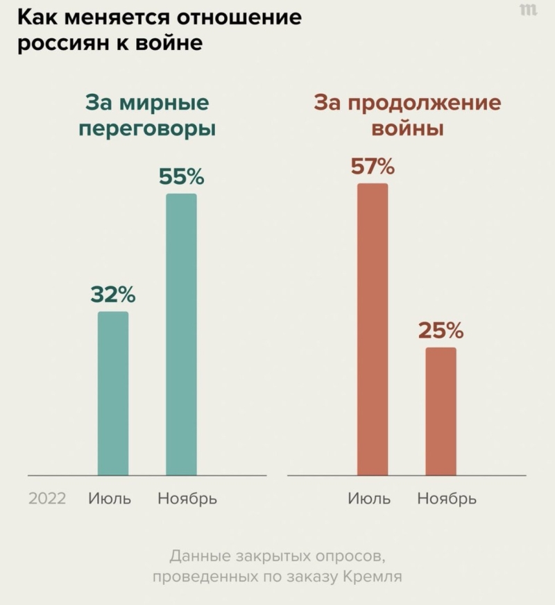 Відношення росіян до ведення бойових дій різко погіршилось – за даними соцопитування, яке проводилось ФСО, для Кремля та лише для внутрішнього користування, 55% підтримують початок перемовин, а 25% виступають за продовження бойових дій. Ці дані збігаються із результатами жовтневого опитування «Левада-Центру», де результати показали 57% та 27% відповідно.