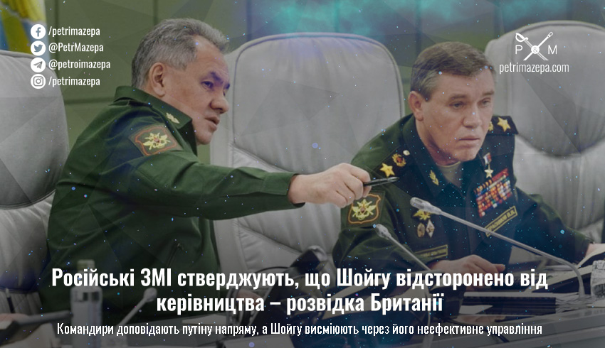 «Через проблеми у війні проти України російський міністр оборони Сергій Шойгу наразі відсторонений від керівництва, оперативне командування доповідає про перебіг війни напряму путіну. Російські офіцери і солдати з безпосереднім бойовим досвідом, імовірно, постійно висміюють Шойгу через його неефективне та відірване від реальності керівництво», — повідомляється у звіті розвідки, оприлюдненому в офіційному Twitter-акаунті Міністерства оборони Великої Британії.
