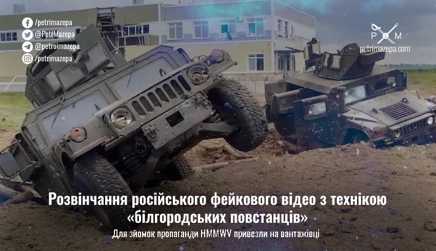 Російські ЗМІ оприлюднили фото та відео нібито техніки білгородських повстанців, знищеної та пошкодженої в бою. Особливо дивно виглядали на ньому новенькі та чистенькі HMMWV. Тому розвінчання цієї постановки не забарилося.