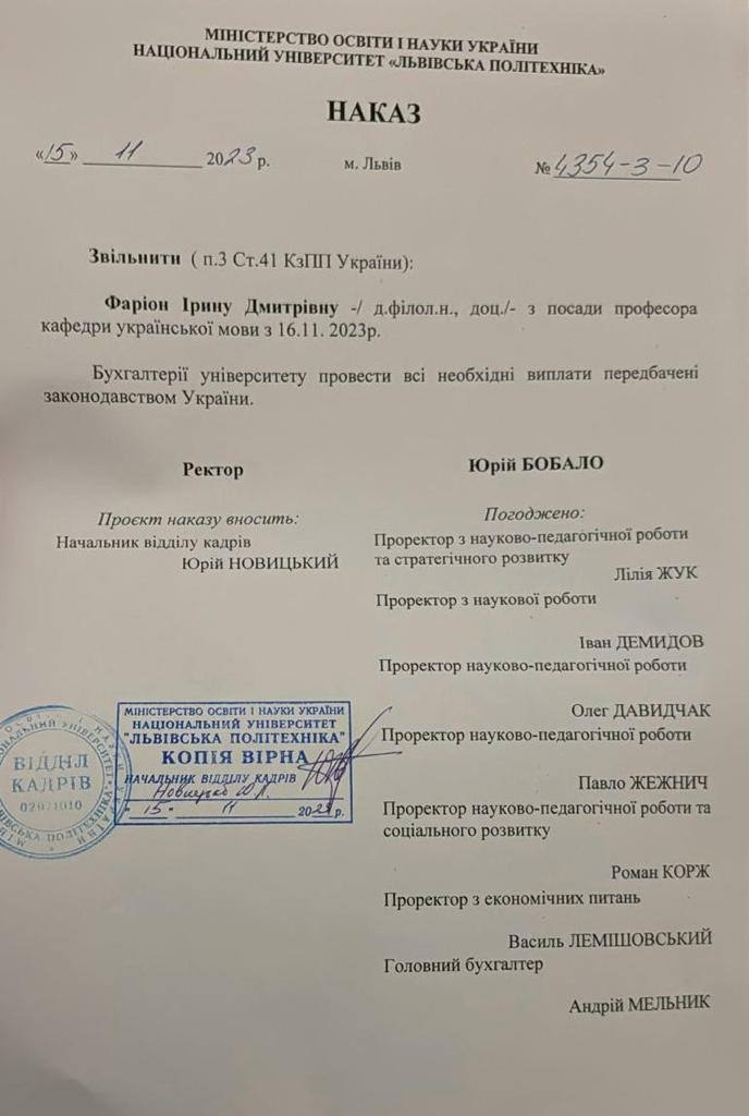«Привід — порушення Фаріон 41 статті Кодексу законів про працю: вчинення працівником, який виконує виховні функції, аморального проступку, не сумісного з продовженням даної роботи», — уточнили у виші.