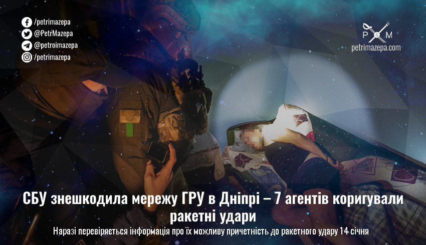 Контррозвідка Служби безпеки України (СБУ) нейтралізувала агентурну мережу головного управління генштабу збройних сил рф (більше відому як гру). Ця багатоетапна спецоперація проводилася у Дніпрі й завершилася затриманням 7 російських агентів.
