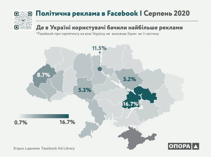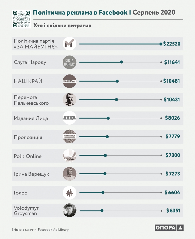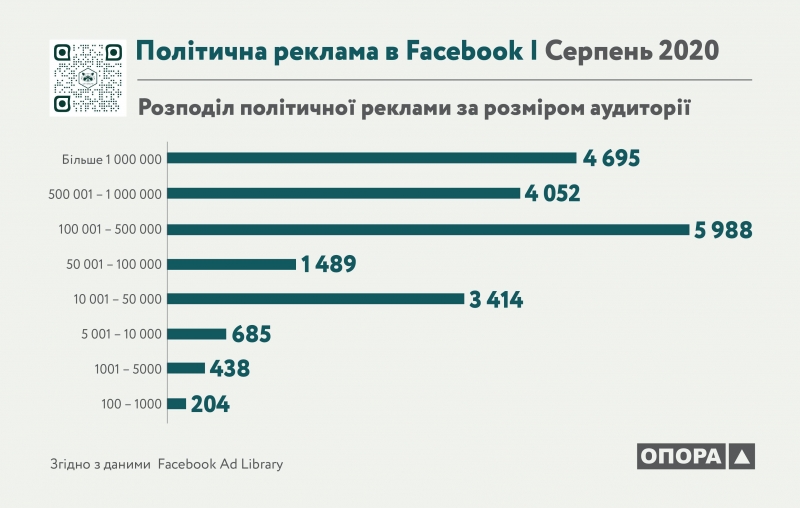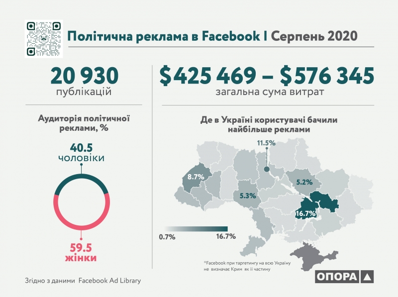 * Моніторинг політичної реклами в Facebook, який здійснила ОПОРА, включає дані за 1-30 серпня 2020 року. Оскільки Бібліотека політичної реклами пропонує 30-денний діапазон дат для отримання і завантаження даних, які зберігаються в сховищі.