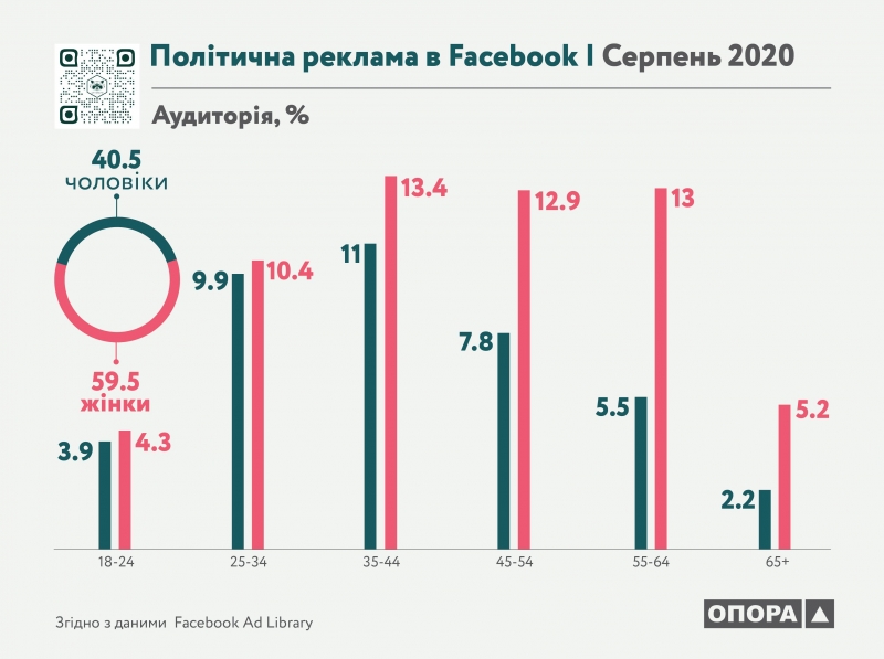 Налаштовуючи свою політичну рекламу, здебільшого її замовники обирали жіночу аудиторію (60%). Відповідно чоловіча аудиторія політичного промо-контенту склала лише 40%. Однак у серпні змінився вибір у налаштуваннях за віковими групами. Як серед жінок, так і серед чоловіків у фокусі замовників політичної реклами були користувачі 35-44 років.