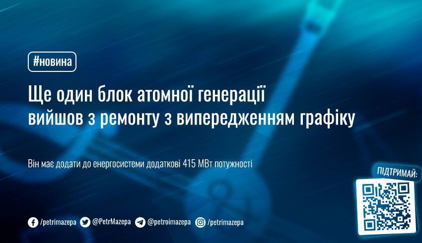Станом на ранок сьогодні, 11 жовтня, з випередженням графіку вийшов з ремонту черговий блок атомної генерації.