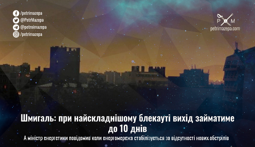 «При найбільш складному випадку повного блекауту, коли взагалі все розбито, вихід займає від 7 до 10 днів. Це за розрахунками наших енергетиків. Підкреслю, це теоретичні розрахунки, бо світ не переживав ще таких речей», — сказав Шмигаль.